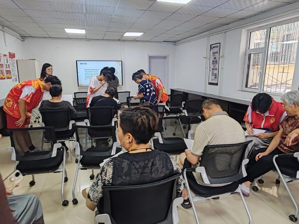 活动围绕健身操的好处、教学步骤、实践要点展开。主讲人李渔鑫详细讲解健身操对心肺功能、关节灵活性的改善作用,以及缓解压力、增强社交等心理益处。教学环节从热身运动开始,通过颈部拉伸、关节旋转等动作预热身体,随后示范并指导基础动作,鼓励老年人逐步跟随练习。现场气氛活跃,老年人们认真模仿动作,相互交流,展现出对健康生活的热情。