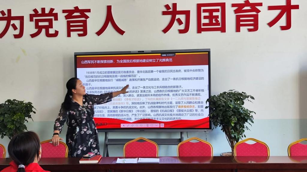 赵胜男为志愿者们讲解“太行精神”和山西在抗日战争中的重大贡献,还从“七亘大捷”、“百团大战”、“中共阳泉市委、市人民政府成立”等脉络,讲述中国共产党领导创建的第一座人民城市——阳泉的红色历史。志愿者们一起朗读《阳泉:中国共产党领导创建的第一座人民城市》和《中共创建第一城 阳泉红色百年纪事》节选,从讲解原文中,让志愿者们更加深入地了解他们的第二故乡阳泉,这座坐落在太行山中部西麓,历史悠久,山河壮丽,物产丰富,人民勤劳的迷人小城。