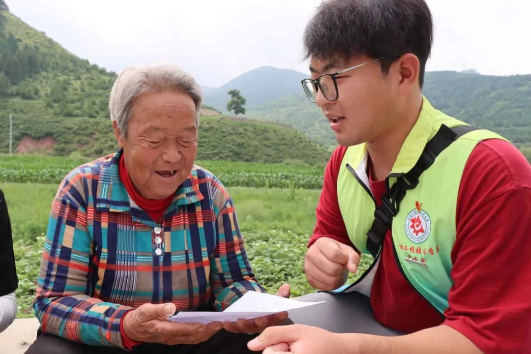 7月10日,“红心向阳”社会实践服务队走进北方沟村采访了与习近平总书记在三棵树广场握手的村民郭振荣,并为当地村民宣讲了健康医疗类政策、救助保障类政策和金融保险类政策。