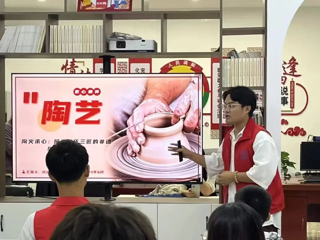 宣讲团首先将目光投向文化传承领域,讲述了“张氏三匠”——张文亮、张宏亮、张维亮兄弟的非遗陶艺传承之路。在父亲山西省首位“中国陶瓷艺术终身成就奖”获得者张聪大师的熏陶下,三兄弟自幼与陶泥窑火结缘,各自在刻花瓷、砂器、釉料研究等领域深耕细作。他们不仅守护了平定刻花瓷、砂器等国家级非物质文化遗产,还通过创建博物馆、与院校合作等方式,让古老的阳泉陶艺焕发新生。张氏家族四代人对陶艺“泥坯经千度窑火方成器”的坚守精神,令居民感受到文化传承中蕴含的深沉匠心。