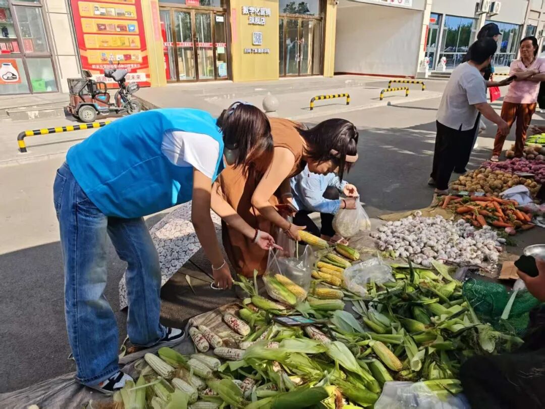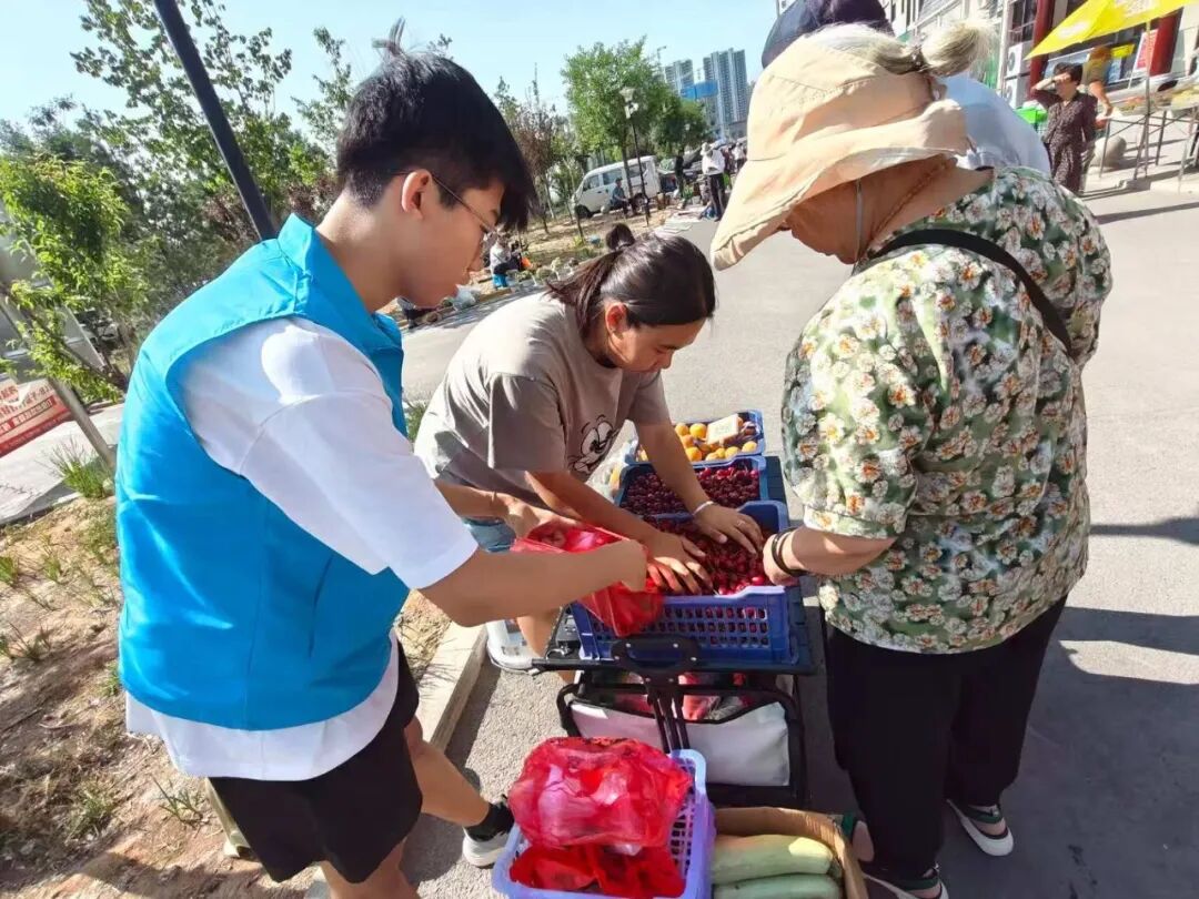 当顾客到来,王丽璟热情地为他们介绍玉米的产地与价格,帮助挑选最新鲜玉米进行剥皮;张珂专注于包装环节,熟练地为顾客装袋,确保果实和玉米在携带过程中不受损伤;刘子渝负责摊位卫生,及时清理顾客剥下的玉米皮等垃圾,保持周边环境整洁。另一侧,韩意安带领的小组正将昨日摘的杏和樱桃码成小山,他们喊出“先尝后买”的口号,用最朴素的营销方式拉近农户与消费者的距离,协助摊主全部卖出。