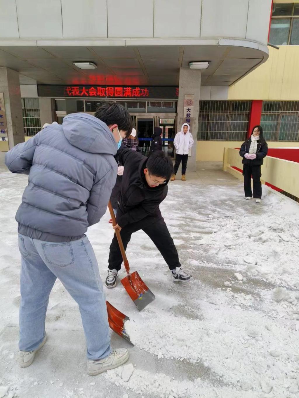 近日,一场冬雪将校园装扮得银装素裹,给同学们带来冬日的欢乐,但也给出行带来了安全隐患。为清理积雪、方便师生出行,12月14日早晨,在大数据系吴晋华老师的带领下,大数据与智能工程系学生积极投入到扫雪除冰工作中。
