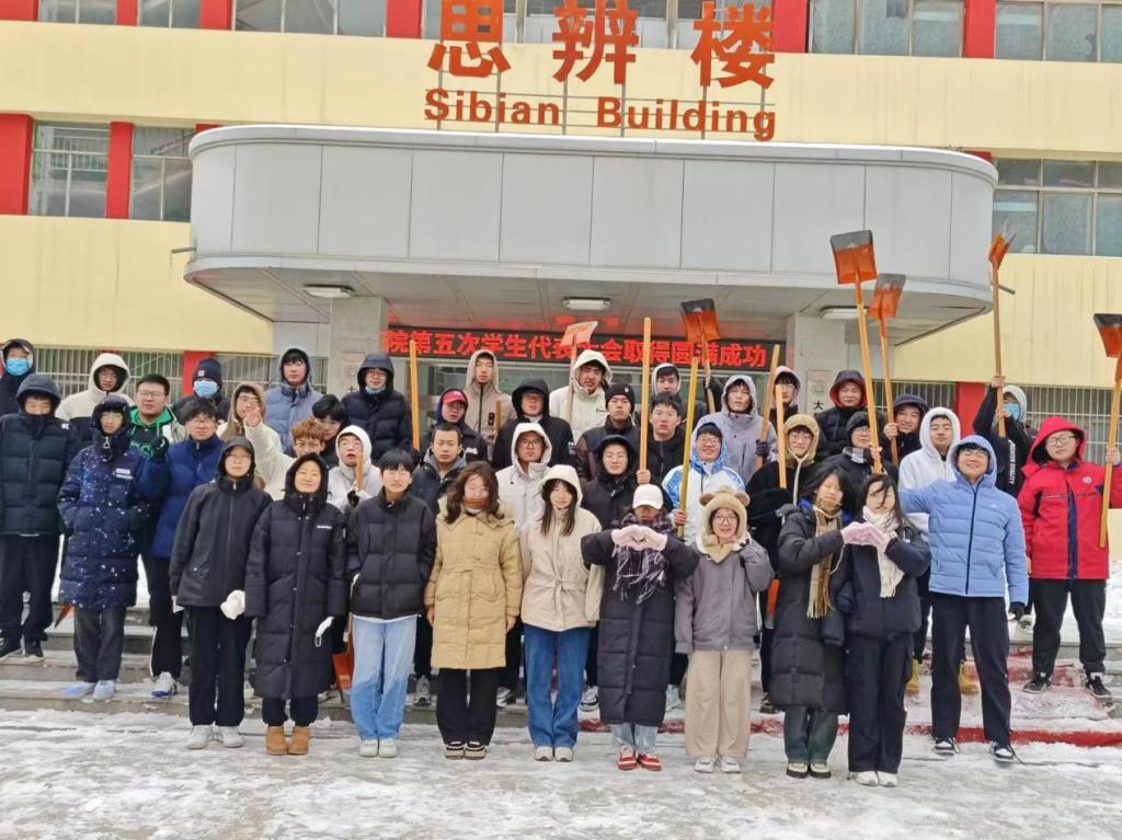 本次活动集中在思辨楼附近校内主干道等人流量较大区域,活动范围广、积雪厚度大。同时,由于过往车辆的来回碾压,冰雪紧紧附着在地面上,加剧了清扫的难度。扫雪除冰各小组机动灵活、注意方法,通过化大区域为小片、以散点带整面的方式专注劳动。同学们利用铁锨、扫把等工具,相互配合,在提高效率的同时保证路面清洁的质量,并将积雪堆至道旁,最终把主要通行道路上的积雪浮冰清扫干净。 本次活动不仅有利于更好保障师生出行安全,维持正常学习工作秩序,而且增强了同学们的团结协作的意识和无私奉献的精神,激发了青年的青春朝气,弘扬了青年迎难而上、担当有为的奉献精神。