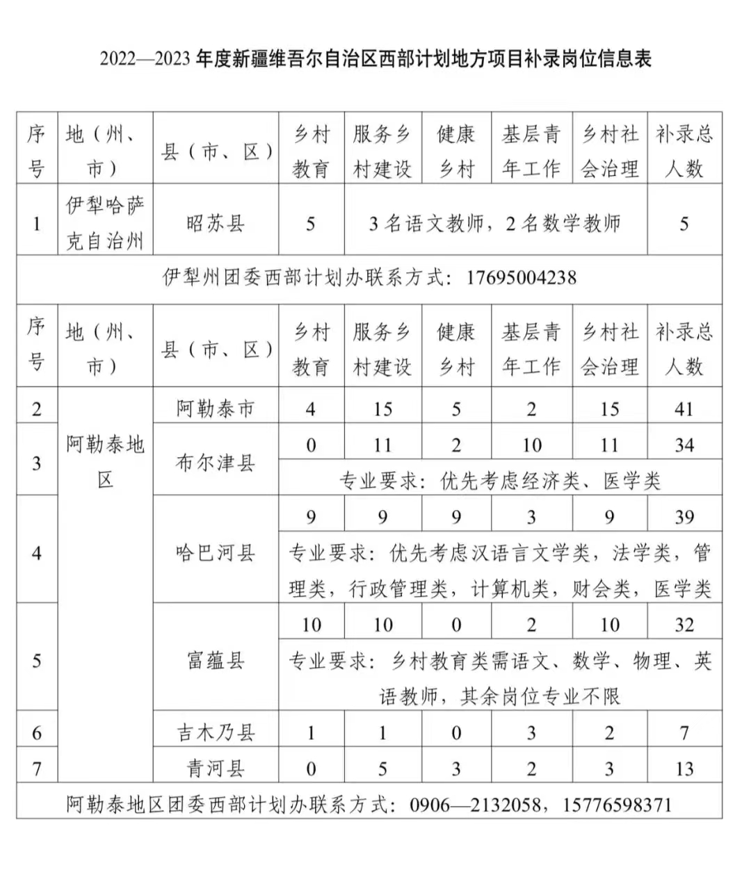 2022—2023年度新疆西部计划招募培训派遣工作已基本完成,鉴于部分新招募志愿者因个人原因放弃招募岗位,根据《关于印发<2022—2023年度大学生志愿服务西部计划实施方案>的通知》(中青联发〔2022〕2号)相关要求,经自治区团委研究,正式启动2022—2023年度新疆维吾尔自治区西部计划地方项目志愿者补录工作,现将补录工作有关事项公告如下。