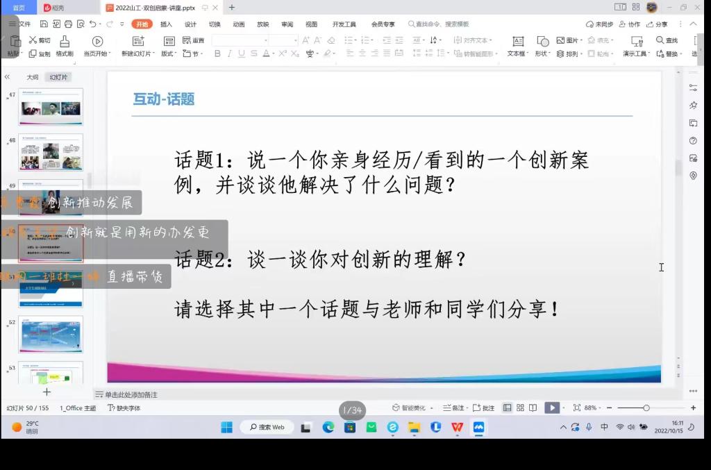 本次培训特邀北京中关村智酷双创服务股份有限公司双创产品总监、中国国际“互联网+”大学生创新创业大赛展示交流中心项目组成员朱广超老师担任主讲,共计500余青年学生参与其中。培训期间,在线人数居高不下,一个个贴近生活的例子,点燃了同学们对创新创业的好奇与热情,形成良好的创新创业氛围。