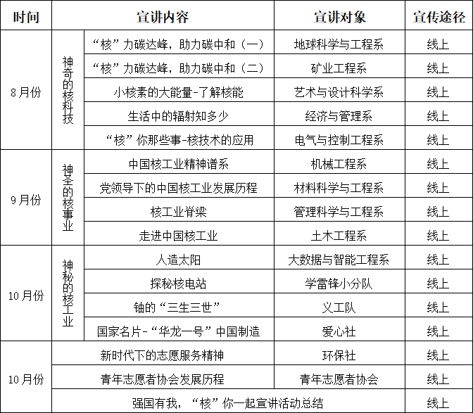 为深入宣传贯彻习近平生态文明思想,引导社会公众和广大青年学生理解和把握实现碳达峰碳中和的生态目标,倡导当代青年践行简约适度、绿色低碳、文明健康的生活方式,以实际行动迎接党的二十大胜利召开。团中央青年志愿者行动指导中心、中国核工业集团有限公司、中国青年志愿者协会秘书处联合开展了“强国有我 ‘核’你一起”大学生志愿宣讲活动。