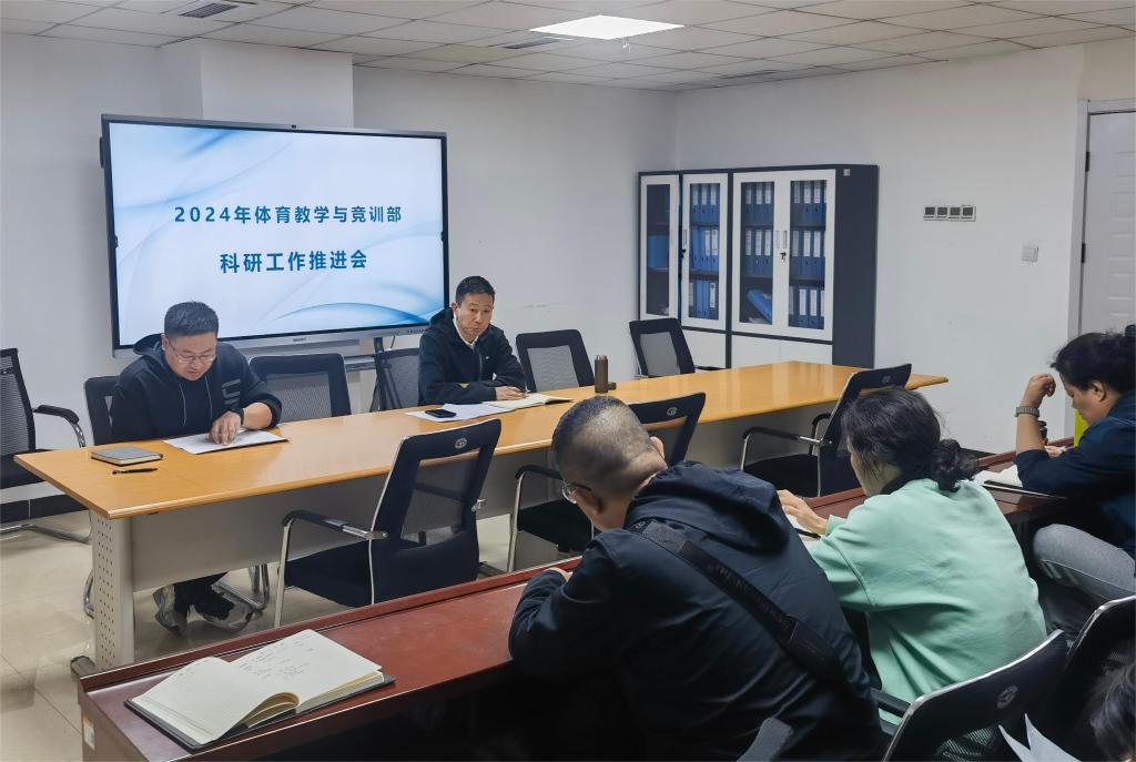 2024年3月28日下午,在学院体育馆会议室召开了2024年体育教学与竞训部科研工作推进会,高级职称教师及各教研室主任参会。