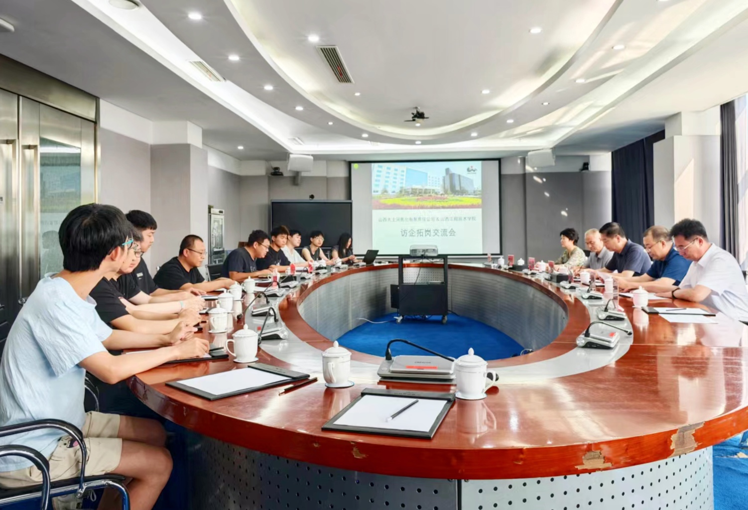 大土河公司副总经理冯云旺和人力资源总监姚海兵代表企业对张长青一行表示热烈欢迎,并介绍了山西大土河焦化有限责任公司的创办历程、运营情况、发展规划以及人才需求等情况。冯云旺作为学院93级地质与测量专业的校友,对学院对山西大土河焦化有限责任公司的关心和帮助表示感谢,为母校发展取得的巨大成就感到自豪。他表示,未来将为母校毕业生创造更大的成长和发展空间,用待遇留人、用文化留人。