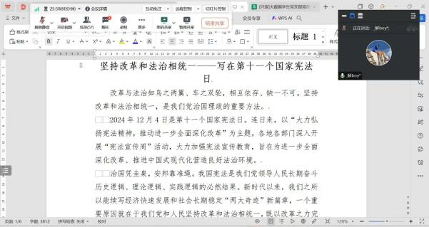 为深入贯彻党的法治建设方针,积极响应习近平总书记关于法治工作的重要论述,大数据与智能工系学生第一党支部于2024年12月6日在线上开展了以“深入学习贯彻习近平法治思想”为主题的主题党日活动。支部书记史建芳老师以及支部全体党员、预备党员、拟预备党员、积极分子均参加本次会议。大会由荣佳同志主持,学生第一党小组进行领学。