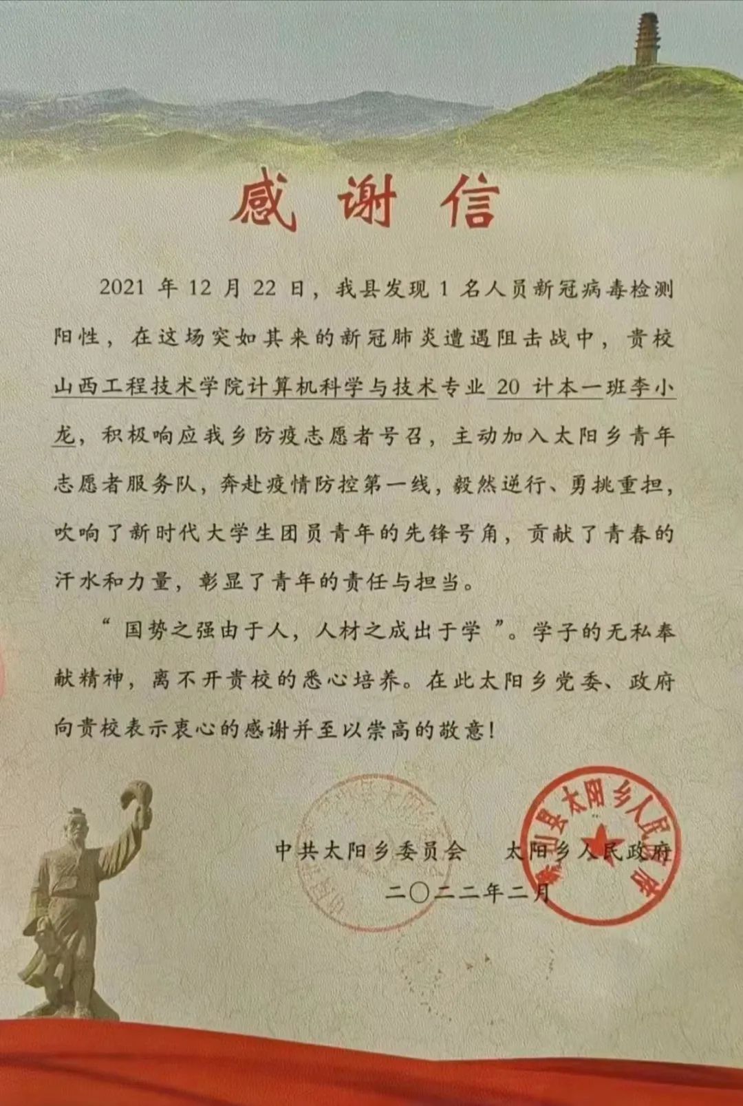 2021年12月22日,运城市稷山县发现1名人员新冠病毒检测阳性,在这场突如其来的新冠肺炎遭遇阻击战中,贵校ac米兰官方网站计算机科学与技术专业20计本一班李小龙,积极响应我乡防疫志愿者号召,主动加入太阳乡青年志愿者服务队,奔赴疫情防控第一线,毅然逆行、勇挑重担,吹响了新时代大学生团员青年的先锋号角,贡献了青春的汗水和力量,彰显了青年的责任与担当。