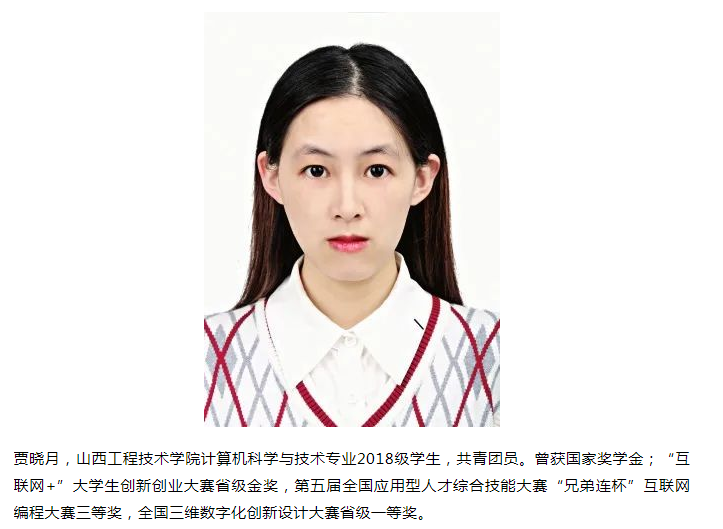 贾晓月,ac米兰官方网站计算机科学与技术专业2018级学生,共青团员。2021年获国家奖学金,入选山西省百名国家奖学金获奖学生典型代表名录,曾获“互联网+”大学生创新创业大赛省级金奖、铜奖,第五届全国应用型人才综合技能大赛“兄弟连杯”互联网编程大赛三等奖、全国三维数字化创新设计大赛省级一等奖、第四届全国大学生创新方法应用大赛国家级二等奖、获“优秀共青团员”、“三好学生”、“优秀学生干部”的称号。三年平均绩点位列专业前三,立志精研学术,多方面发展。“非学无以广才,非志无以成学”,《诫子书》的这句话在大学生活中体现地淋漓尽致。在这个最大的学习平台中,贾晓月和学识丰富的老师、团结奋进的同学、与志同道合的朋友,共同搭建一艘通往梦想的小舟。面对丰富多彩的大学生活,有人因为困难而选择逃避,而更多的人选择迎难而上。贾晓月作为其中一员,不断丰富自己的阅历,去充盈自己的生活,在大学生活打造属于自己的精彩。