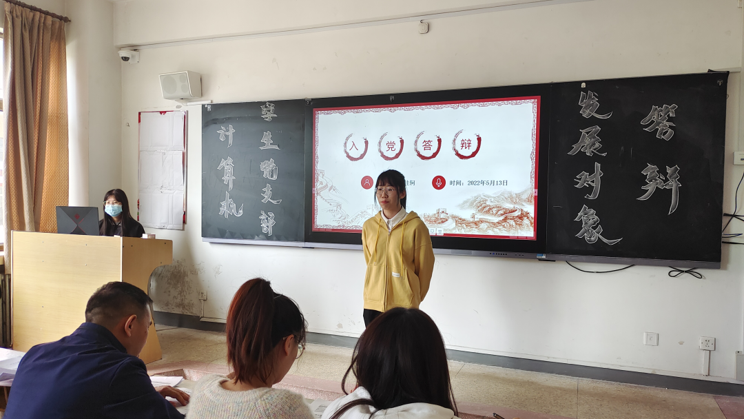 此次答辩分为自我介绍、陈述入党动机、已抽辩题答辩以及现场提问三个环节。会议开始,党员发展对象对个人的基本情况、入党动机、确定为入党积极分子后表现等方面进行阐述。而后,党员发展对象就抽取的题目依次进行答辩。考察题目围绕“对入党誓词的正确理解”“社会主义初级阶段的科学认识”以及“当前疫情下,我国社会制度的优越性”等展开。在作答过程中党员发展对象思维清晰灵活,逻辑严谨,以扎实的学习对问题做出了详细正确的解答,同时以个人的生活经历表达了对中国共产党的敬仰及对成为中国共产党员的向往,争取努力发展成为一名合格的共产党员。
