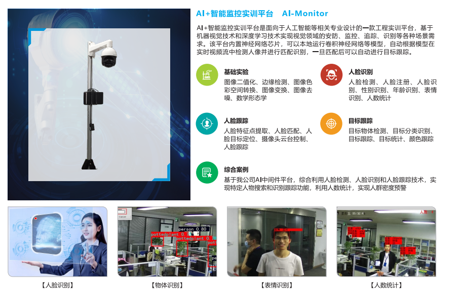 人工智能实验室主要承担智能科学专业所需课程实验、实训教学任务,另外还承担全国“蓝桥杯”初赛工作。教师可以针对《人工智能程序设计》课程开设的实验项目主要有:Python嵌入式编程、Python嵌入式通信、Python机器视觉应用设计、Python综合应用设计;针对《视觉处理》课程开设的实验项目主要有:机器视觉基础、机器视觉算法、机器视觉应用、深度学习应用、机器视觉云服务、机器视觉综合案例。教师还可以在此为学生讲授和演示各种人工智能方面的实例,开设实训项目。主要有以下几方面的内容:机器语音与语言技术、机器视觉技术、Python应用技术。